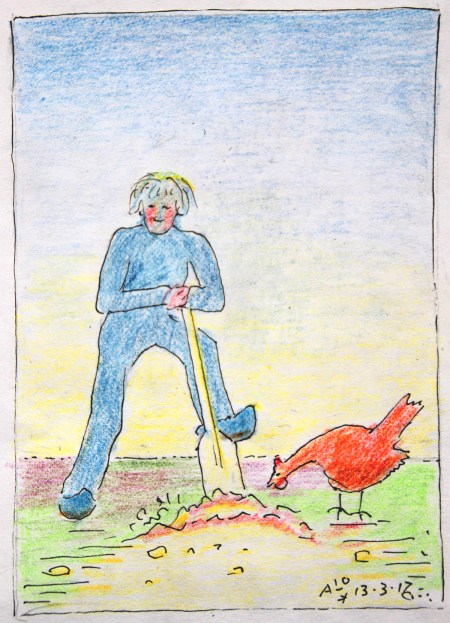 In gedachten zie ik een met rijen bomen beplante akker voor me, met rijen lagere gewassen er tussen in. Het is een permacultuurboerderij. Tussen de bomen rijdt een smalle trekker, over een smal spoor, om te oogsten. Maar ik zeg niks van wat ik voor me zie. Ik heb deze man nog maar net ontmoet, en ben te gast in dit Brabantse land. Als gast kun je beter eerst luisteren en niet alles beter weten, vind ik.