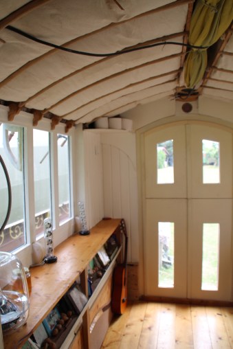 Een heerlijk hoekje onder het zachte plafond, tussen zachte wanden. Nu is het een zithoek. Maar het ophijsbare middenblad is neer te halen met touwen. Met het resterend stuk matras er op, maak ik hier elke avond mijn heerlijk brede bed.