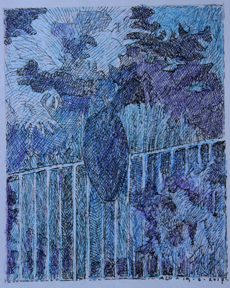 Buiten tekent de bovenkant van het ijzeren hek zich af als een oplichtende streep en daar, op het hek, zie ik wat zitten. Het lijkt op een vogel. Zou het diezelfde zijn die ik net ook al zag? Ik liep net nog over het veld toen er iets groots over me heen scheerde. Ik kon het niet goed zien, hij vloog snel het kleine bos in, dat bij de vijver ligt. Hoge populieren torenen als donkere wachters boven de plas uit. Daar vloog hij heen. Zou hij toch weer terug gevlogen zijn?