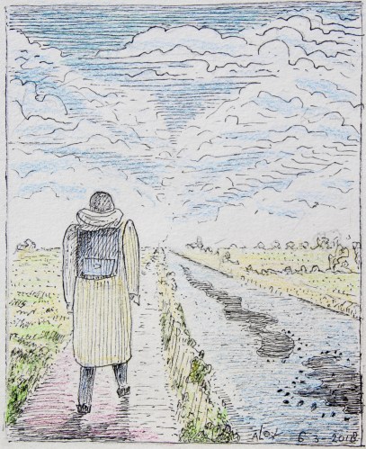Terwijl ik op mijn fiets stap denk ik aan Frijlân, de plek waar ik straks heen ga. Ook daar zullen kinderen zijn om te spelen en te leren op de boerderij. “Leren van nature,” wordt de slogan. Wie weet kom ik vaker in zo’n kinderdrom te staan. Als ik wegfiets over het asfalt, waait een frisse wind om mijn hoofd en zonlicht schijnt over het boerenland. Nog even en het zal ander land zijn, waar ik fiets, waar ik de lente zie ontluiken, een ander land en Friese kinderen. Zou er ook een geitenboer zijn?