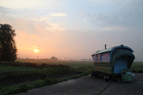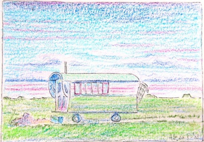 Hier sta ik, op het weidse vlakke land, het land dat ik in gedachten had, toen ik mijn woonwagen zijn kleuren gaf, het groen van de wei en een uitgestrekte horizon met de lucht erboven. Ik ben waar ik wezen moet. Alles is er klaar voor. Ik heb minicamping de Ontginner achter gelaten, ik hoef niet meer uit te stappen bij bushalte “Toekomstweg‘. De toekomst is begonnen.