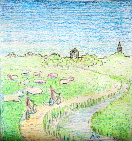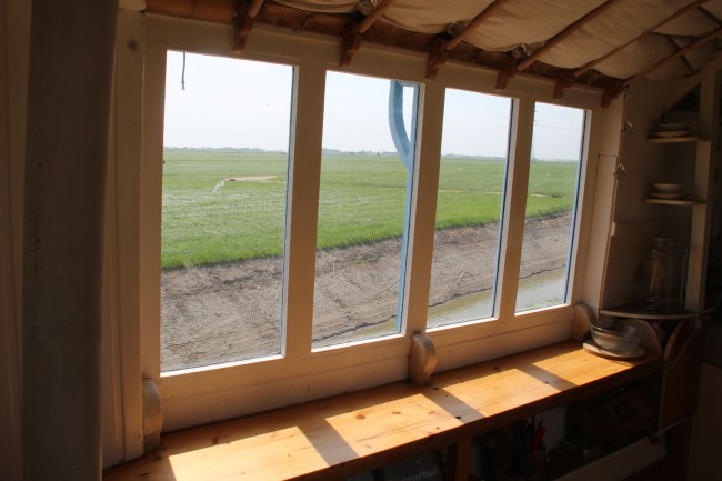 De tweede dag waait het nog steeds. Ik word wakker en open de luiken. Achter de luiken is het uitzicht totaal veranderd. Geen bomen meer met vinken, mezen, spechten, geen grasveld vol madelieven en merels, nee, nu zie ik een uitgestrekte weide van 85 hectare groot! Eindeloos is het. Een groep kauwtjes trotseert de harde wind en scharrelt in het groene raaigras.