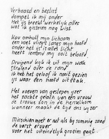 De bodem heeft tijd nodig om te kunnen ontvangen. En ook de mensen moeten wennen aan iets nieuws. Daar denk ik steeds weer aan. Er is veel tijd. Ik hoef me niet te haasten. En al die tijd kunnen we spelen en genieten! Als gewortelde nomade ben ik begonnen met liedjes schrijven. Ik denk dat het gaat over de verhalenpaden, die langzaam zullen groeien. De bloemen, de bomen, de dijk, de grond. . . de stenen, de beelden. . . Zijn dit niet dezelfde “Songlines” waar de Australische aborigionals over spreken? Begint een nieuwe wereld niet met het lied van de verbeelding? Wij mensen zijn scheppers, zei ooit een boer tegen mij, die de omslag maakte. Daar denk ik nu aan. Maak van de kanteling een dans, en zing!