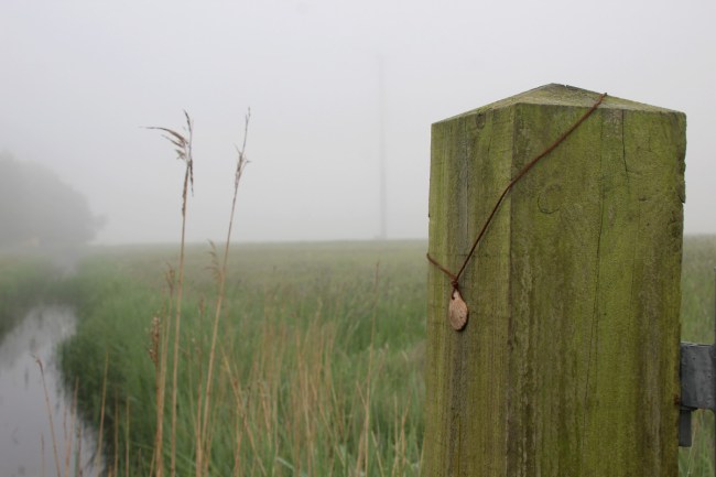 Voor dat hek, daar sta ik nu. Het is een zwaar ijzeren hek, en het is altijd dicht. Ik ga eromheen, over het smalle randje beton, tussen de brandnetels door. Onder mij is de sloot en ik hoor kikkers kwaken als een koor. Je kan verschillende stemmen horen, zachte en harde. Terwijl ik daarnaar luister haal ik zonder nadenken het koord van mijn pols af. Ik hang het om de dikke paal heen, gemaakt van meerpalenhout. Zonder erbij stil te staan loop ik verder. Ik werk de hele dag door. Als ik het op de terugweg weer zie hangen, verbaast het me. De symboliek is bijna magisch. Ik heb met mezelf afgesproken dat dit Verhalenpad mij zal leiden naar mijn pelgrimstocht van de toekomst. En daar hangt hij dan,, de Jacobsschelp, als symbool van … wat eigenlijk? En Waarom? Wat zal dit mij nog meer vertellen, in de mist van de tijd? Alles wat groeit ademt toewijding aan het leven. En ik maak er deel van uit. Hier. Trouw aan mezelf. Wat er ook gebeurt.