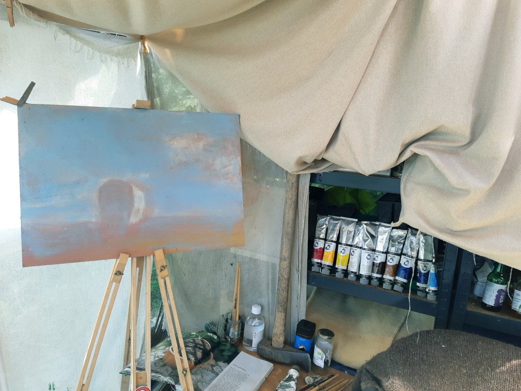 Aan de overkant van de weg hangt een hangmat in de bosjes. Het scherm dat erboven is gespannen, klappert hard heen en weer. Het is van een jongen die bij het groepje hoort, dat daar kampeert. De jongen van de hangmat is de leider, op deze onstuimige middag. Samen met de andere jongens heeft hij een windscherm gemaakt om de uren tijdens de storm toch genoeglijk door te kunnen brengen. Het waait flink maar het regent niet en regelmatig schijnt de zon. De hoge bomen maken een hoop herrie, maar toch hoor ik hun stemmen nog, die onder het zeil vandaan komen.