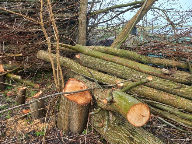 Het is dubbel. Enerzijds is het een tijd om blij te worden. Het toverachtige stofje dat alles doet groeien staat op het punt om los te barsten. Alles is ervan doordrongen. De 730 bomen en struiken die ik plantte laten nog weinig zien, maar de wilgenroosjes, de zilverschoon en de smeerwortel ontvouwen hun eerste blaadjes boven de zwarte grond van het Verhalenpad. Op een andere plek ben ik ook bezig, vlak langs het openbare pad. Ik noem het “Het Voorhof”. Er groeien nu 200 struiken en bomen. Ze groeien langs een dicht op elkaar geplante rij wilgen, achter mijn kleine huis. Op de hoek staan ze zo dicht op elkaar, dat er nodig meer ruimte moet komen. Ik zaag een paar wilgenbomen om, de meidoorn en de kastanje kunnen hun takken nu vrij uitstrekken. Met veel genoegen stapel ik de takken op tot een houtril. Ietsje verderop loopt de wilgenrij weer gewoon door, de stammen dicht op elkaar, steeds hoger groeiend. Het is maar een klein hoekje, dat ik heb weggehaald. De stronken zullen opnieuw uitlopen en terugkomen als dichte struiken. Vogels en insecten zullen er beschutting vinden. Daarachter staat mijn gereedschapswagen, een aanhanger met deksel. Er zitten nog steeds zonnepanelen op, die stammen uit de tijd toen ik rondtrok door het Noorden van Friesland. Ernaast liggen de restanten van het vlot, dat ik maakte voor een documentaire, en daarna weer uit elkaar heb gehaald. Ik heb het zo opgestapeld, dat eronder ruimte is. Zo is het weer iets nieuws geworden. Het is het terrein van het winterkoninkje, een plek vol hoekjes om weg te kruipen en beestjes te vinden. Ik heb hem ook nog een eigen nestkast gegeven, die ik middenin de houtril heb verstopt. Ik hoorde het, toen hij het ontdekte. Een opgewonden gekwetter klonk vanuit de dichte berg takken.