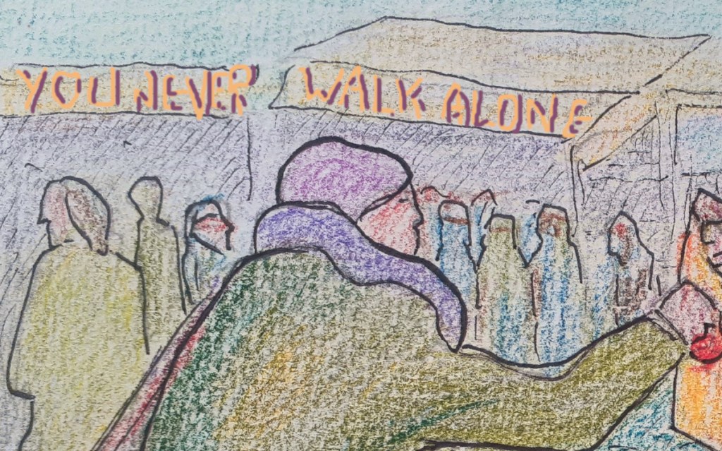 Het inpakken van de kar is nog een heel werk. Bij de kapstok zit ik op de grond om eerst mijn laarzen weer aan te doen, mijn regenbroek ligt naast me. Voor ik daarmee klaar ben gaat ineens het licht uit. “Ik ben hier nog bezig hoor!” roep ik. Een vrouwenstem roept haastig sorry, maar het licht gaat niet meer aan. Vreemd. Een man komt terug, hij komt in het donker naar me toe, wacht tot ik klaar ben en sluit de deur achter ons. Door de lange gang loop ik naar buiten met mijn kar. Dat was het dan. Nu gewoon maar weer naar huis. Gelukkig is de wind gaan liggen, dat scheelt. Anders had ik wind tegen gehad. De man wuift me vriendelijk na.