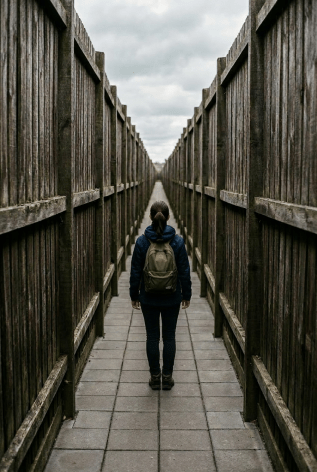 Terug in mijn geboorteplaats. Voor het eerst sinds bijna vijftig jaar loop ik weer door het steegje. Het is een van de steegjes die tussen de tuinen van de huizen door loopt. Het waren mijn favoriete routes. Avontuurlijk was het, het smalle pad tussen hagen en struiken door. Er waren struiken met witte besjes die knapten tussen je vingers. Soms zaten er jongens in het raam die mij beschoten door diezelfde besjes in een pvc pijp te stoppen en heel hard te blazen. Ik lachte, het deed geen pijn en bovendien schoten ze altijd mis. Sommige paadjes waren van grind gemaakt, ik zocht naar de mooiste kiezels of naar vuurstenen die vonkten als je ze tegen elkaar aan ketste. Sommige tuinen hadden tuinhekjes, bij anderen kon je direct het pad oplopen naar de achterdeur. Maar nu! Alles is zo onherkenbaar veranderd. Het lijkt wel een gevangenis. Allemaal dezelfde houten schuttingen torenen hoog boven me uit. Ik hoor maar weinig vogels en ook kinderstemmen ontbreken. Wat is er gebeurd?