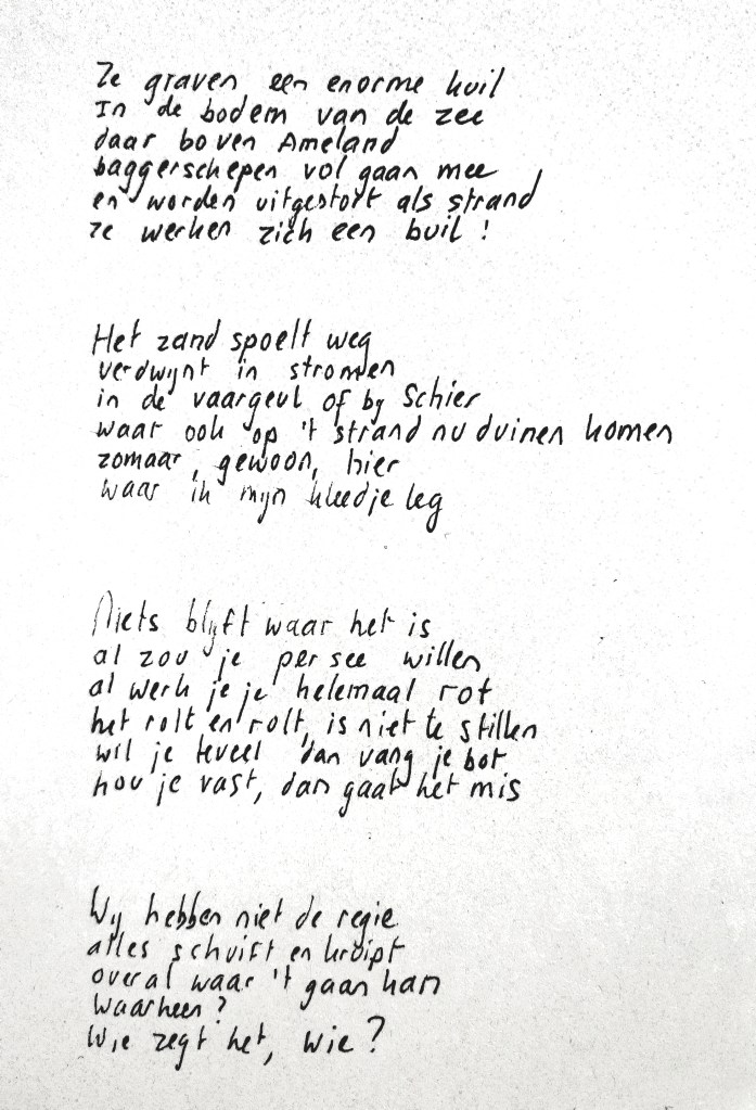 Alles beweegt. Vooral zand, water en wind. Nu is het zo dat het strand van Ameland steeds in zee verdwijnt. Maar een eiland zonder strand, dat kan niet, vinden de mensen. Het strand geeft het eiland ook extra bescherming. Daarom graven ze zand uit de Noordzee en spuiten het tegen het eiland aan. Elke keer opnieuw, want steeds weer verdwijnt het. Hoe? Waarheen….?