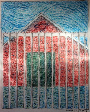 Ik zie drie rijen hokken die in twee verdiepingen boven elkaar liggen. De onderste hokken op kniehoogte, de bovenste op borsthoogte. Een hok bestaat uit een staalplaat van ongeveer twee bij vijf. Hoeveel kippen zouden daar geleefd hebben? Ik weet het niet. Maar het lijkt er op dat er weinig te scharrelen valt.