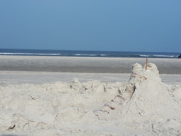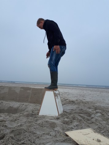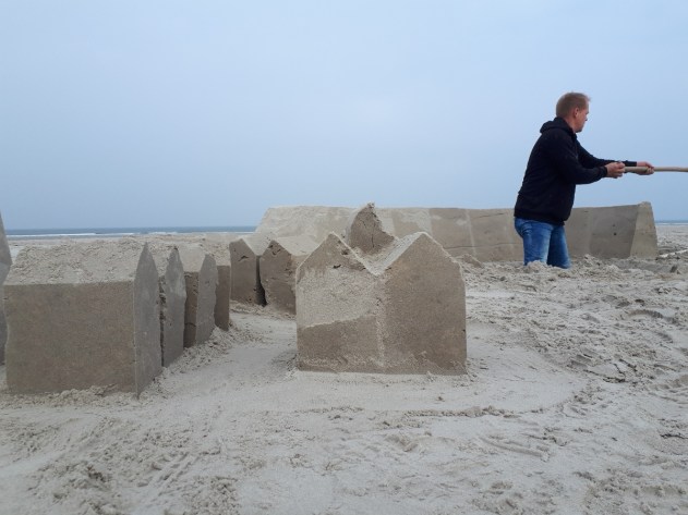 Voor het volgende stuk kan er wél een schip bij komen. Een kraan op het dek schept het natte puin in de vrachtwagen, die het op zijn beurt over de dijk kiept. Dan komt het rupsbandenkraantje, die alles glad strijkt. Net speelgoed. Ik zou zo mee gaan doen. Logisch dat jongens nauwelijks meer van hun machine zijn weg te slaan.