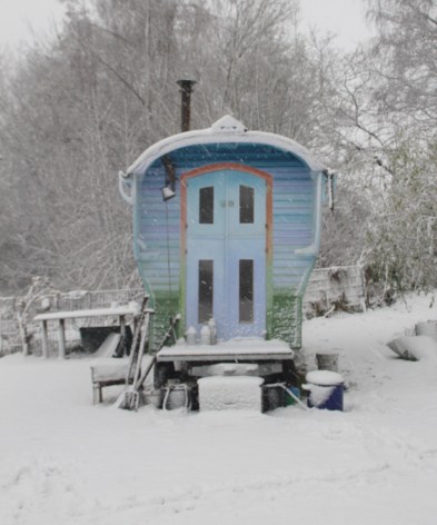 Ik kan nog wèl door de achterdeur. Zo fijn dat ik die heb! Er zitten òòk vier deurtjes, net als voor. De bovenste twee zitten bij mijn bed. Als ik de twee deurtjes open doe, waait er geen koude wind naar binnen. De achterdeur zit nu in de luwte. Dat scheelt! Ik glimlach tevreden. Vanuit het bed klauter ik op mijn sokken naar beneden, de buitenkeuken in. Daar staan mijn klompen. Ze voelen koud aan mijn voeten. Zo kan ik het netjes doen, zonder het bed vies te maken. Het is een hele organisatie, om alles via deze omweg te doen. Water halen, kaas uit de keuken meenemen, schillen naar buiten gooien, plasflessen legen, hout voor de kachel naar binnen sjouwen, de asla van de kachel legen. O ja, ook nog mijn composttoilet, dat moet ook nog naar buiten. Ik ben er zowat twee uur zoet mee.