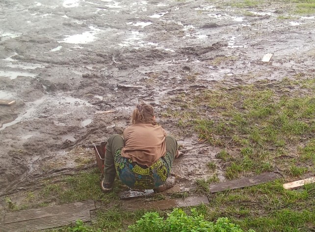 Er moet gewerkt worden. Voor het werk zijn grote machines nodig. Een vrachtwagen, een rupsbandkraan. Het is eigenlijk helemaal geen tijd voor machines. Veel te nat. Maar er was tegenwerking op de route. Maar nu, na drie weken kon het doorgaan. Net nu de regen de grond in een zompige vlakte heeft veranderd. Lekker handig, maar niet heus.