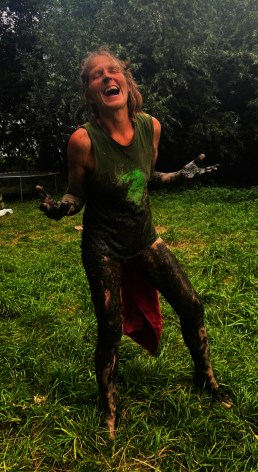 Gelijk daarna vind ik een kikker. Versuft zit hij op mijn hand. Hij lijkt sprekend op een kluitje modder. Ik haal hem een keer door het schone slootwater en zie dat hij zijn bolle ogen wagenwijd open heeft. Zijn keel klopt. Hij leeft dus. Hij mist ook twee poten. De linker voorpoot en de rechter achterpoot. Het is al genezen. Dit is al eerder gebeurd. Misschien is hij eens ontsnapt aan een kraai. Ik besluit hem ergens anders terug te zetten. Ja,in de Swette. daar is meer begroeiing. Daar kan een geamputeerd kikkertje beter schuilen dan hier in de sloot, en in de winter kan hij diep naar de bodem duiken om te slapen. Daarna raap ik nog een aantal waterslakken. Ik gooi ze terug samen met de bos waterplanten, waar ze in zitten. Ik kijk ernaar, mijn armen hangen werkeloos naast mijn modderige lijf. Het is genoeg voor vandaag. Tijd voor een duik in de Swette, de kikker achterna. Dat wordt nog flink boenen.