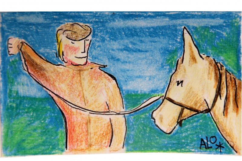 Ik kom thuis en ineens staat er een paard in de wei. Zwart met wit en sokken om de benen. Het is een Tinker. Ik herken hem. Het is hetzelfde paard dat ik weken geleden zag, die keer dat ik langs het Wilhelminakanaal fietste. De ezel balkt van opwinding en rent naar het hek als het dier hem nadert, maar het paard aan de andere kant graast rustig door. Achter de heg staat het woonwagentje verscholen. Een jongensachtige man met blond en halflang haar zit achter een bord macaroni. Hij steekt zijn hand uit. “Jan,” stelt hij zich voor “Wij hebben elkaar eerder ontmoet”. “Ja,” lach ik. “Ik ben Alowieke.. ” Ik kijk het weiland in. “Leuk voor de ezel”, wijs ik, “nieuw gezelschap.” Hij lacht en zegt dat zijn paard toch niet reageert. Naast het kleine wagentje staan twee honden. Het touw waarmee ze vastzitten staat strak en hun neuzen steken allebei in mijn richting. Ik laat ze snuffelen aan mijn hand.